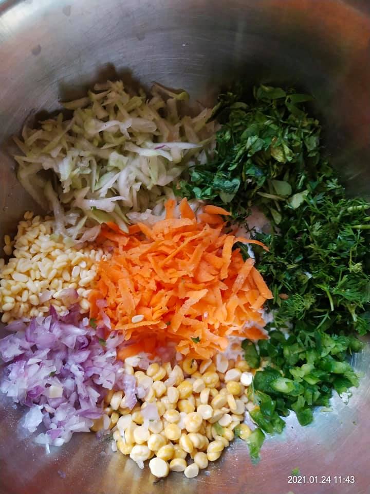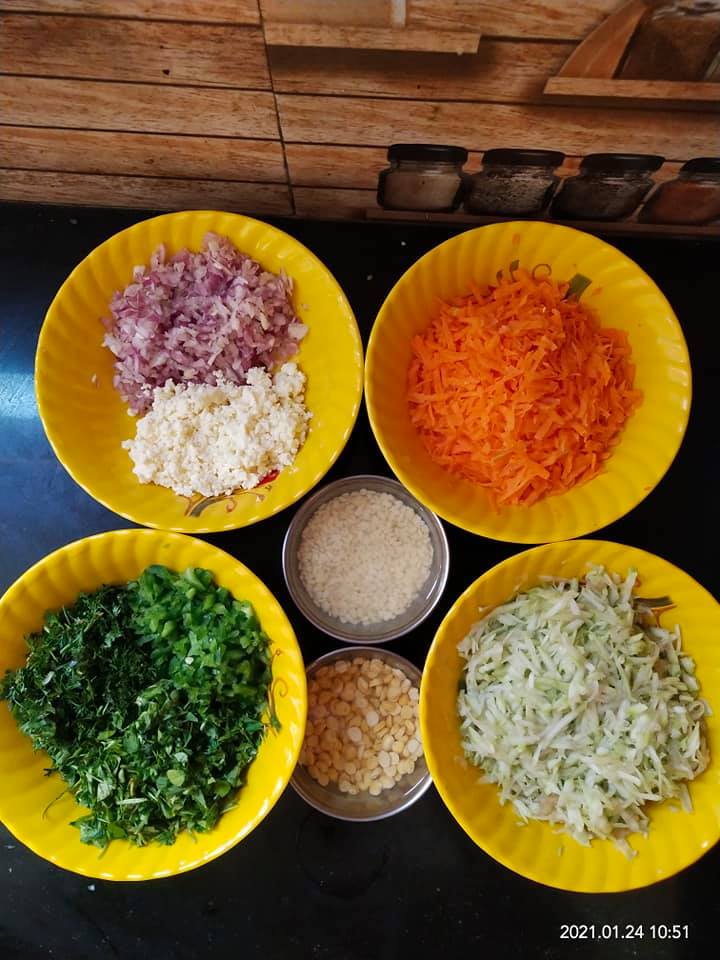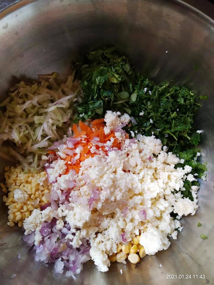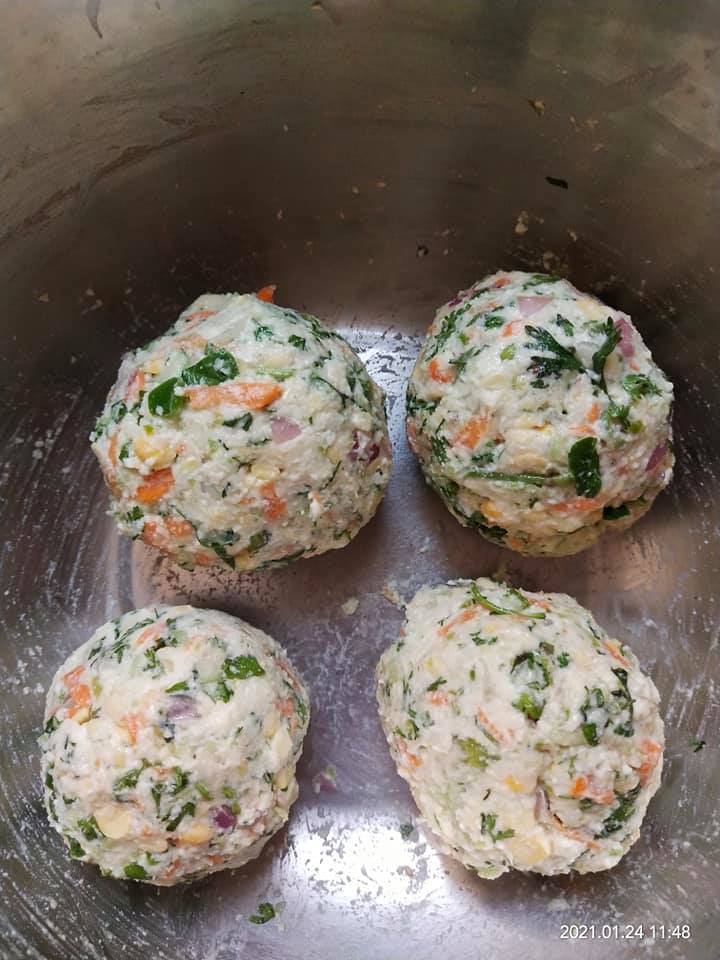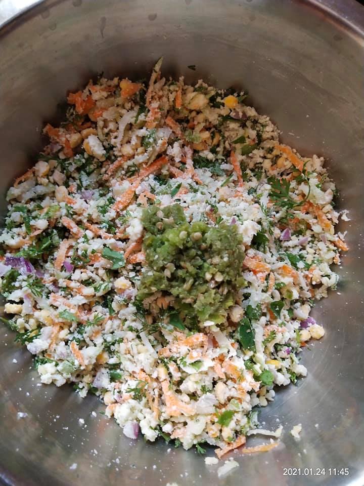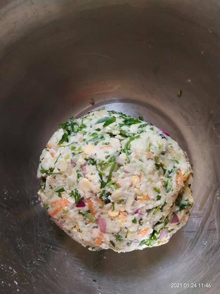 Mix all the ingredients one by one without using water try to bind them by pressing the mix. So that moist from all veggies get it binded. Let it rest for 20mins. Check n add a spoon of water if required.